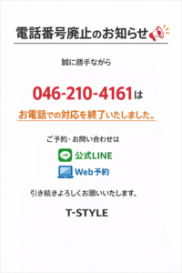 電話番号廃止のお知らせ 2026.03.27 電話番号廃止のお知らせ📢 業務集中及びセッション中に手が止まってしまうことにより、 お電話での対応を廃止させていただきます。 今後のご予約・お問い合わせは、 公式LINE(@t-style) または Web(https://www.t-style10.com/) よりお願いいたします。 ご不便をおかけいたしますが、 何卒よろしくお願いいたします。 春のキャンペーン Prev post